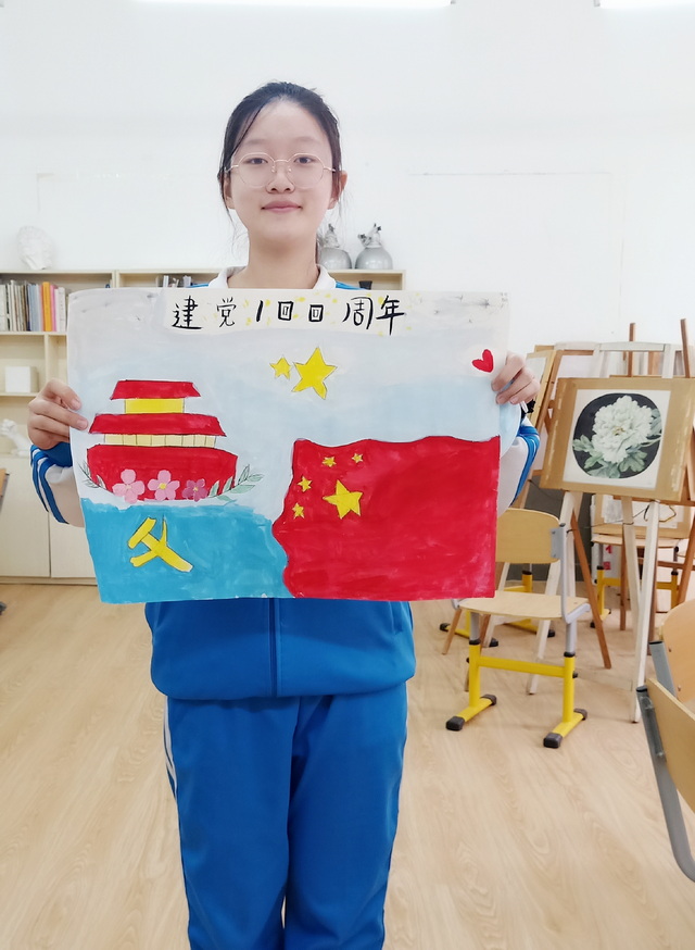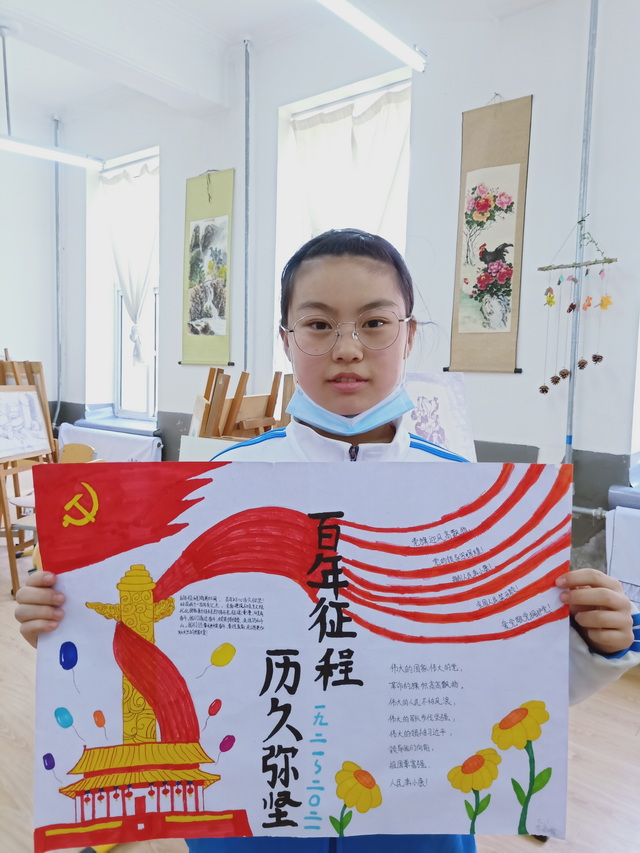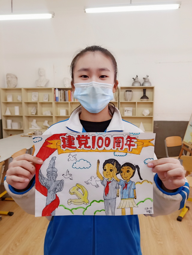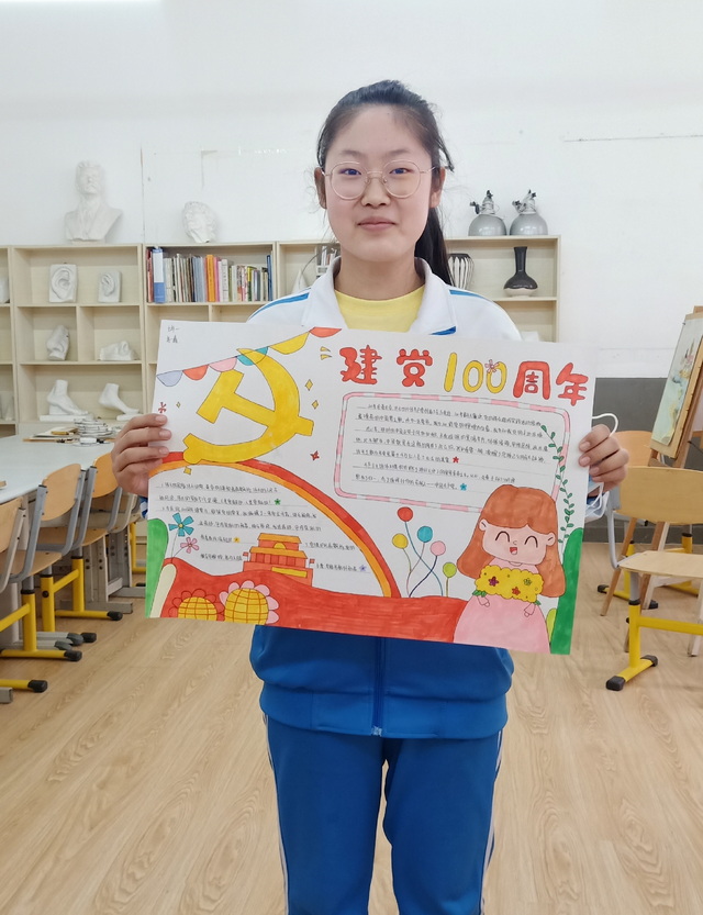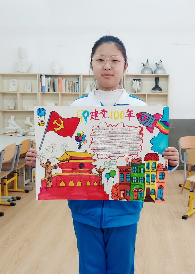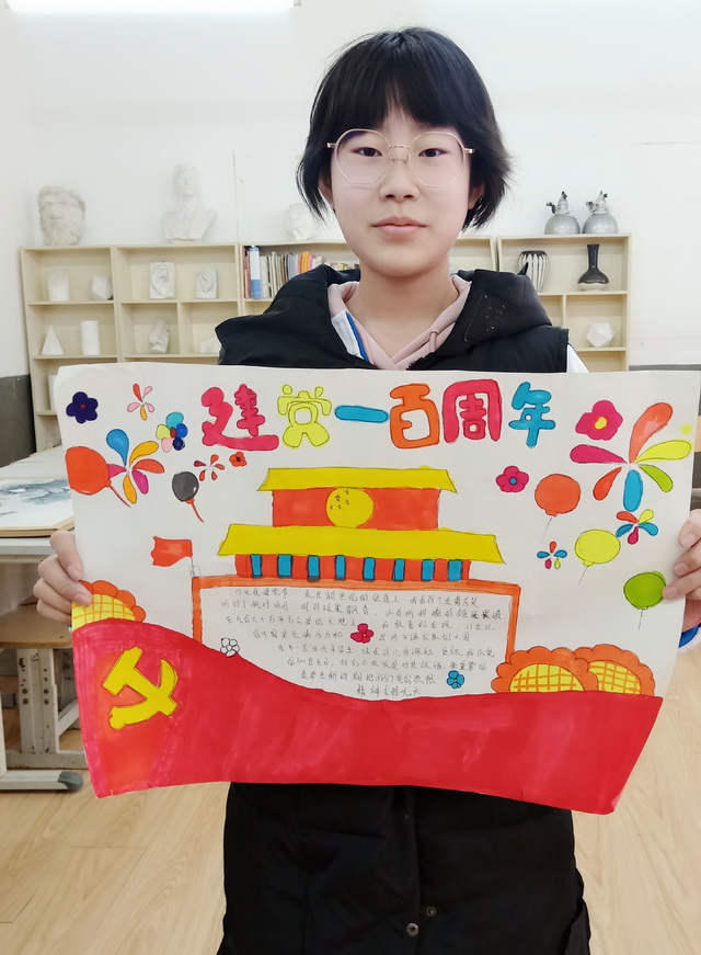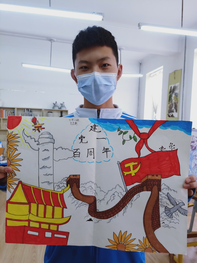 为了庆祝党的百年华诞,鞍山十中在学生中举办了一次宣传画比赛。同学们纷纷响应。在这次比赛上,同学们用最鲜艳的色彩,描绘了对党的无限崇敬之情。他们用国旗和党旗表示对建党百年华诞的崇敬,用天安门、和平鸽、气球和烟花等表达喜悦之情,用向日葵表达了自己对党的信仰。