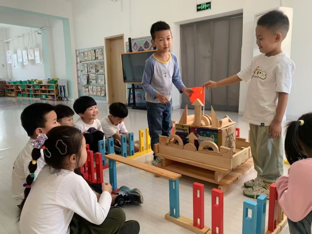 在“认识国旗”互动游戏中,教师通过趣味讲解,帮助幼儿理解国旗的红色象征(革命先烈的鲜血)与五颗星的含义(大星代表中国共产党,四颗小星代表广大人民群众);随后的涂色、粘贴国旗环节,孩子们亲手勾勒鲜红底色、粘贴金黄五星,在实践中深化对国旗的亲近感、尊重感与认同感;在建构区,孩子们发挥想象力与动手能力,用积木拼搭出坦克、城堡等模型,在搭建与分享中直观感受祖国的强大,增强民族自豪感。